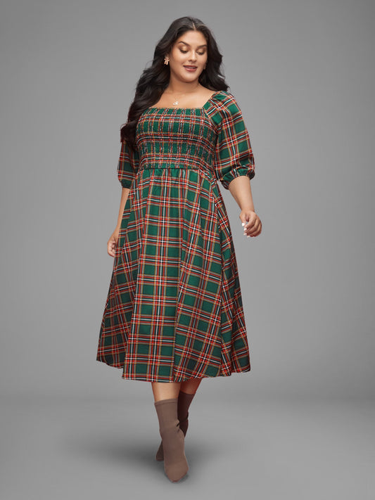 Square Neckline Plaid Smocked Bodice Midi Dress