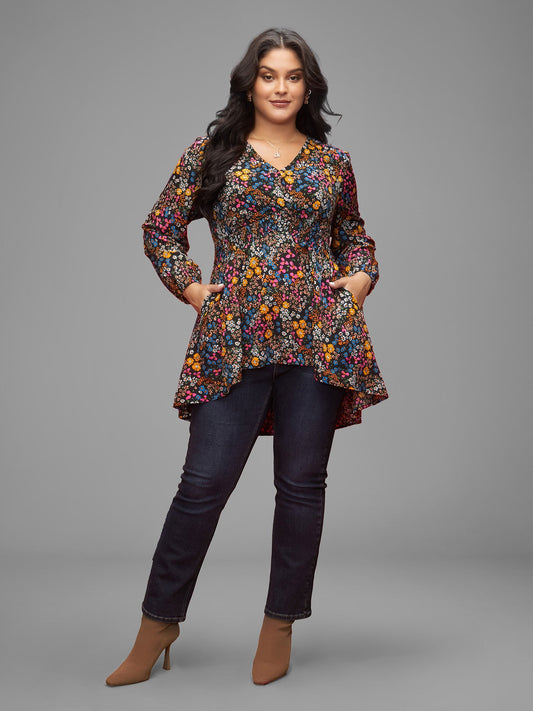Floral Smocked Waistline Surplice Neck Blouse
