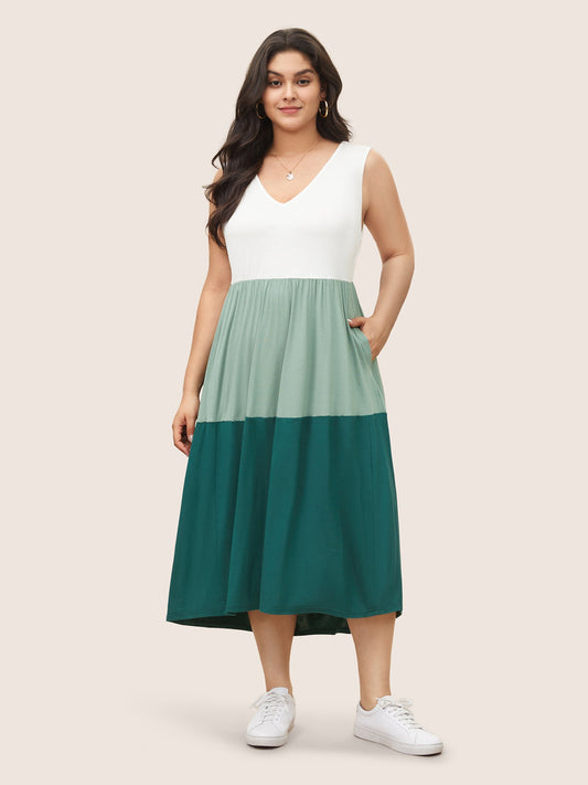 Colorblock Contrast Sleeveless Pocket Ruffle Hem Tank Dress