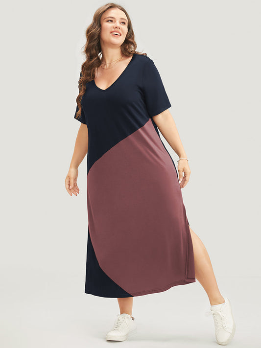 Colorblock Contrast V Neck Pocket Split Hem Dress