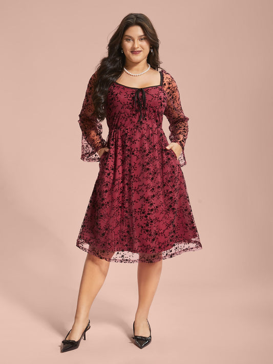 Floral Patchwork Mesh Neck-Tie Midi Dress