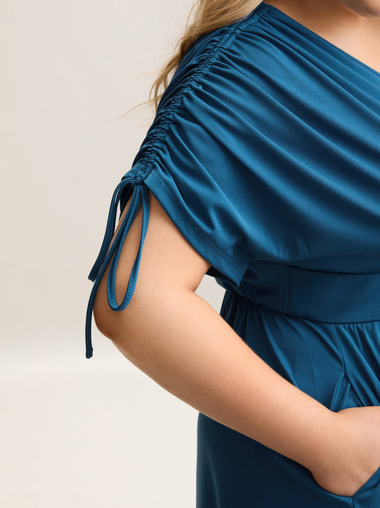 Drawstring Shoulder Surplice Neck Stretchy Midi Dress