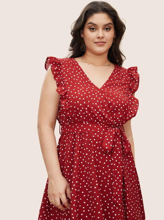 Polka Dot Ruffle Trim Pocket Belted Wrap Dress