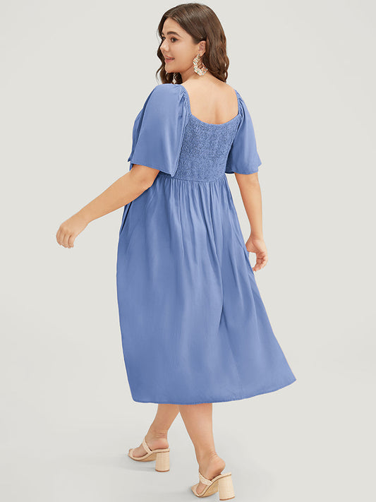 Solid V Neck Ruched Knotted Pocket Ruffle Hem Dress