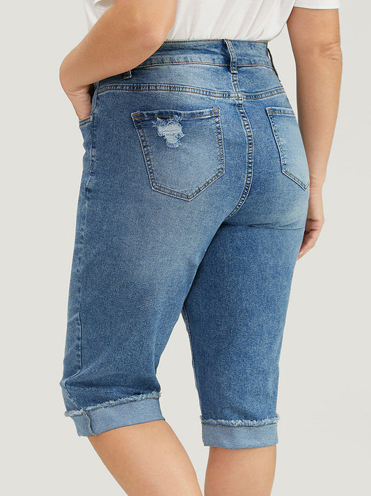 Moderately Stretchy Roll Hem Ripped Knee Denim Shorts