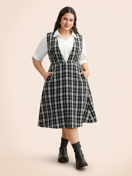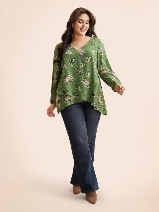Floral Patchwork Pocket Belt Surplice Neck Ruffle Hem Dress
