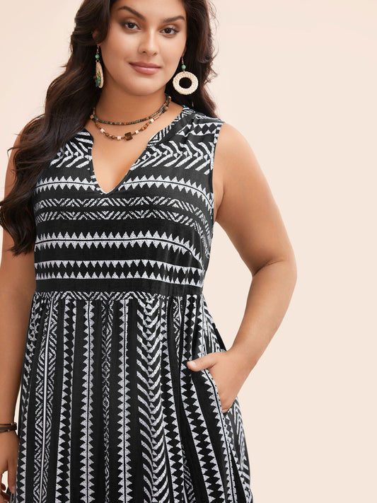 Striped Geometric Pocket Ruffle Hem Sleeveless Tank Dress