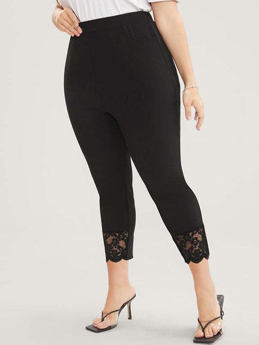 Solid Scalloped Trim Elastic Waist Pocket Lace Hem Pants
