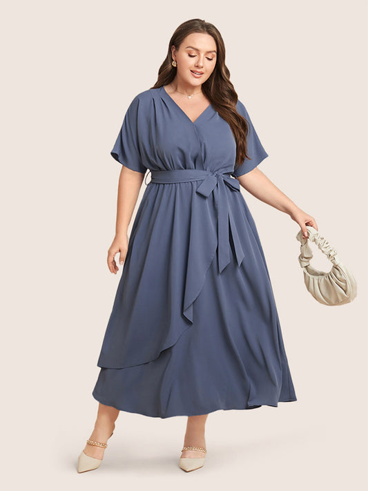 Plain Dolman Sleeve Pocket Belted Surplice Neck Flutter Dress