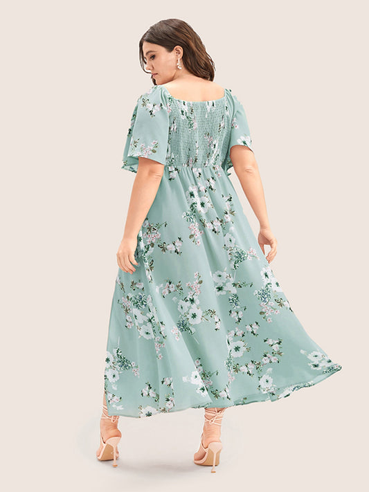 Floral Square Neck Ruffles Pocket Shirred Split Dress