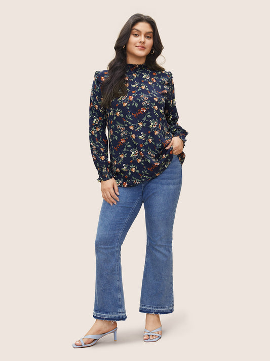 Floral Lantern Sleeve Shirred Mock Neck Blouse