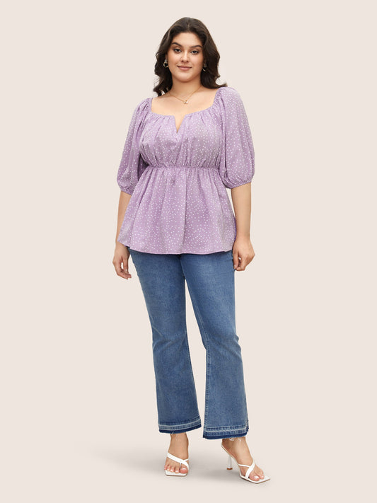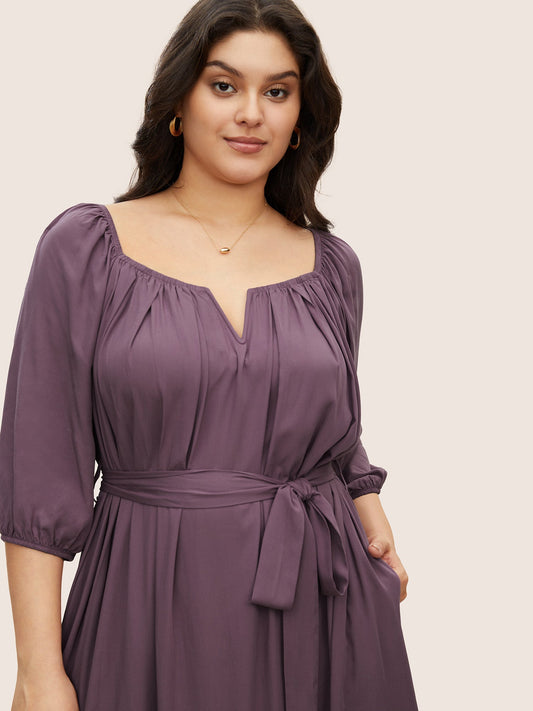 Solid Notched Puff Sleeve Belted Flutter Hem Dress