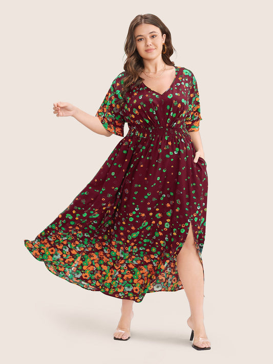 Floral Printed Pocket V Neck Shirred Split Hem Dress
