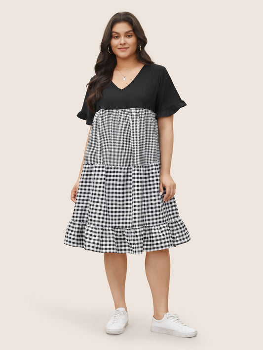 Gingham Patchwork V Neck Pocket Ruffles Dress