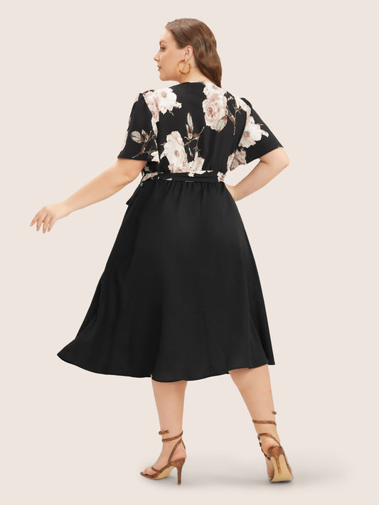 Floral Printed Pocket Ruffles Surplice Neck Belted Midi Dress