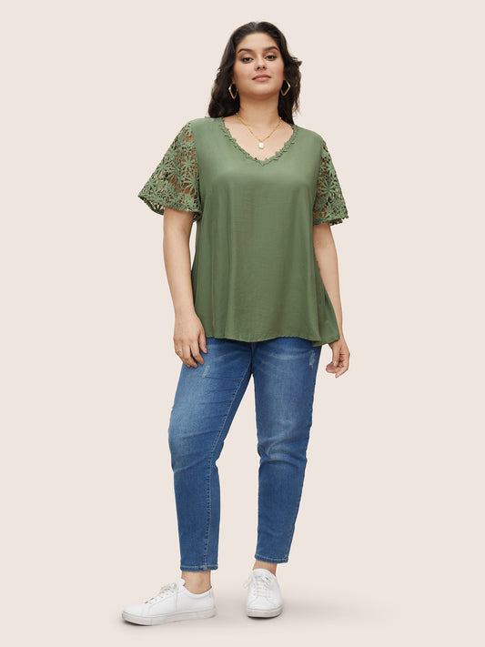 Floral Embroidered Ruffle Sleeve Keyhole Round Neck T-shirt