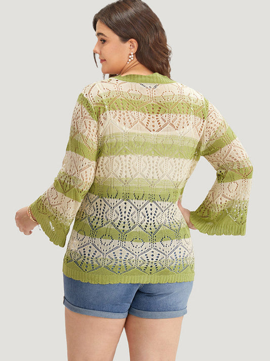 Colorblock Contrast Eyelet Bell Sleeve Ties Cardigan