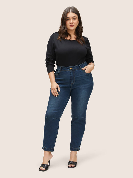 Dark Wash Button Detail Split Hem Tapered Jeans