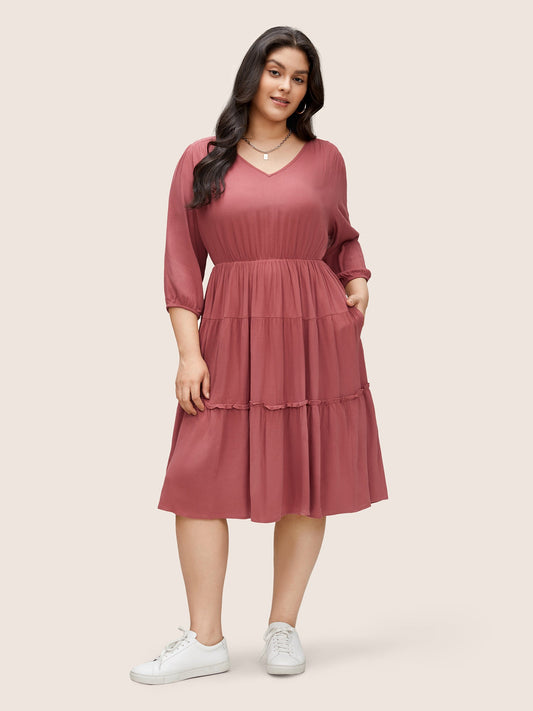 Solid Frill Trim Crinkled Ruffle Layered Hem Dress