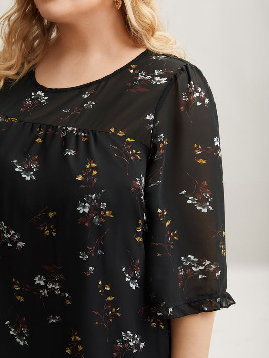Floral Print Sheer Ruffled Trim Sleeve Shirt