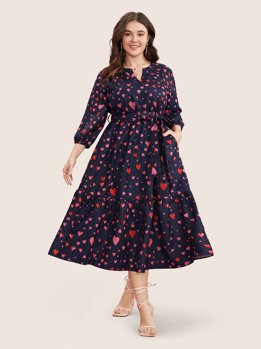 Heart Print V Neck Pocket Belted Lantern Sleeve Ruffles Dress