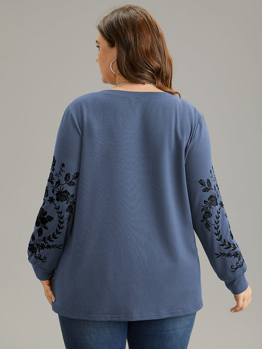 Plants Embroidered Elastic Cuffs Crew Neck Sweatshirt