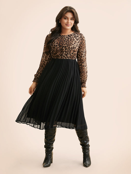 Leopard Print Patchwork Mesh Pleated Dress