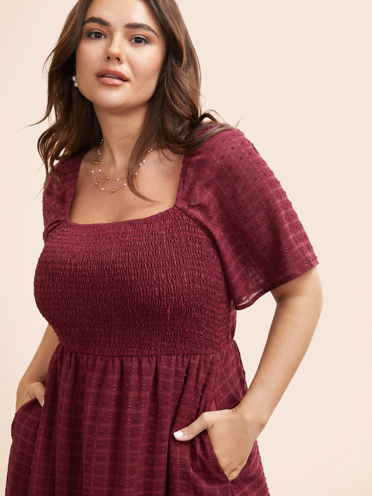 Square Neck Textured Shirred Midi Dress