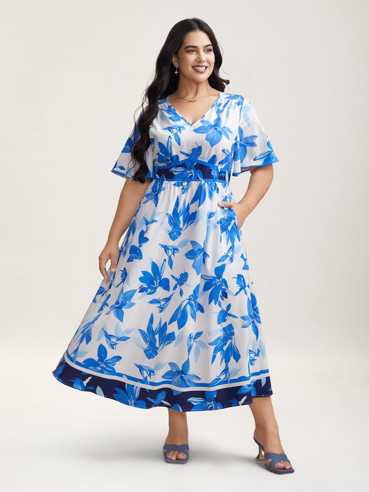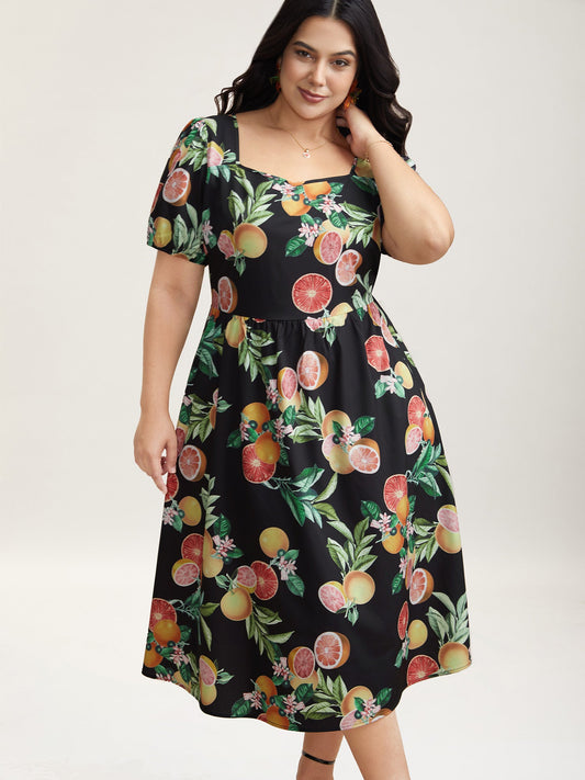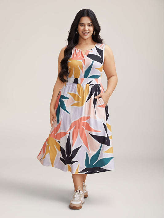 Fall Leaf Print Stretchy Waist Placket Midi Dress