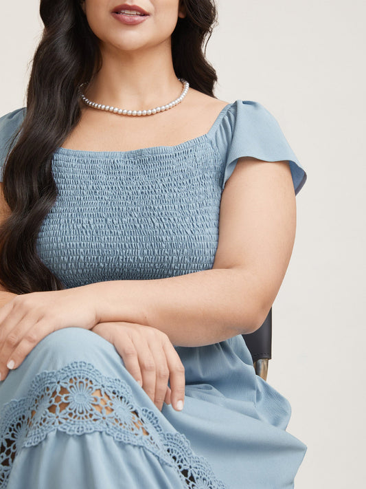 Shirred Stretchy Waist Lace Trim Midi Dress