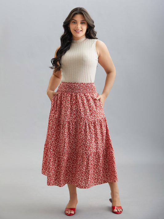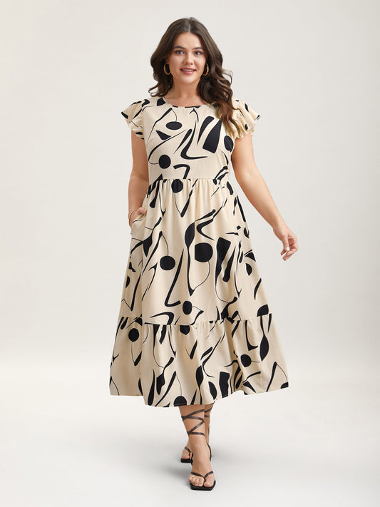 Geometric Print Flutter Sleeve Tiered Midi Dress