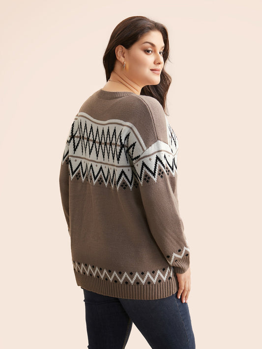 Round Neck Geometric Drop Shoulder Cardigan