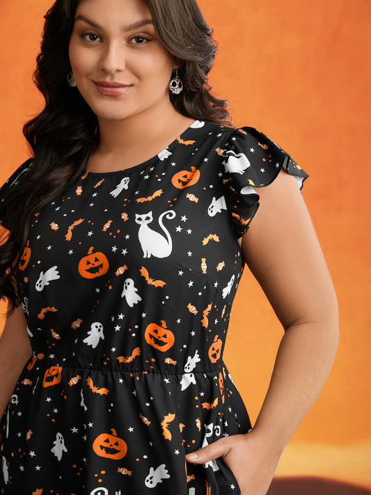 Pumpkin Printed Ruffle Sleeves Midi Dress