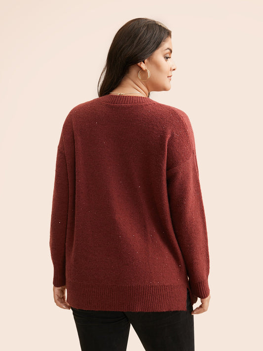V Neck Glitter Dropped Shoulder Split Hem Pullover