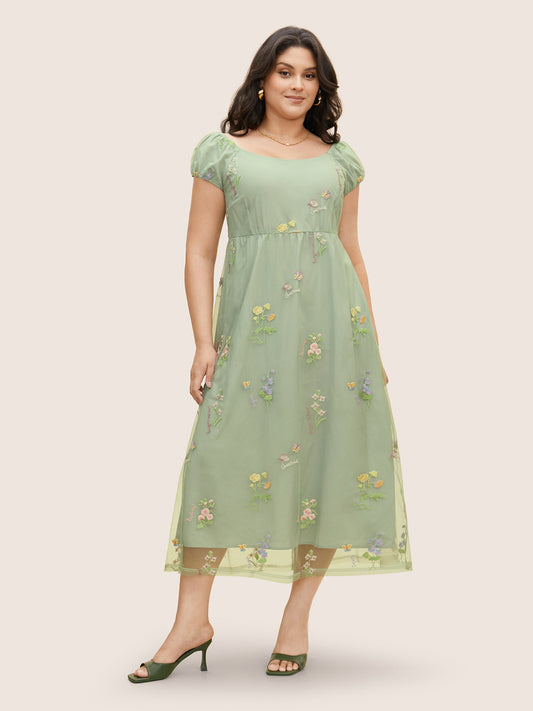 Mesh Floral Embroidered Cap Sleeve Midi Dress