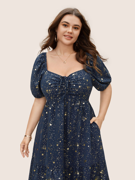 Star Glitter Drawstring Lantern Sleeve Dress