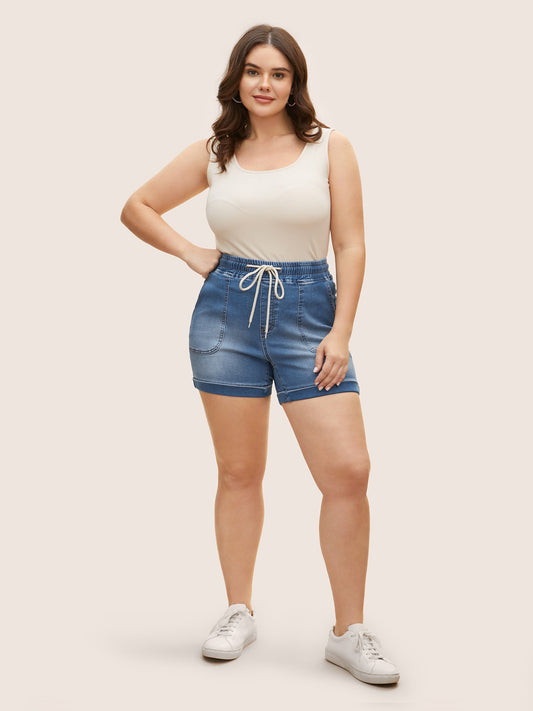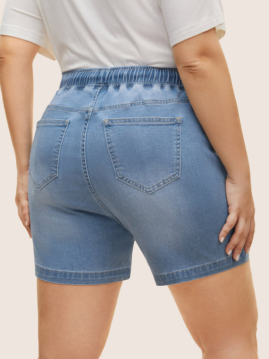 Light Wash Elastic Waist Drawstring Denim Shorts