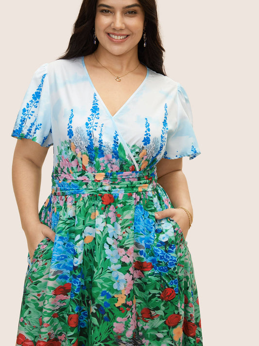 Surplice Neck Floral Ruched Midi Dress