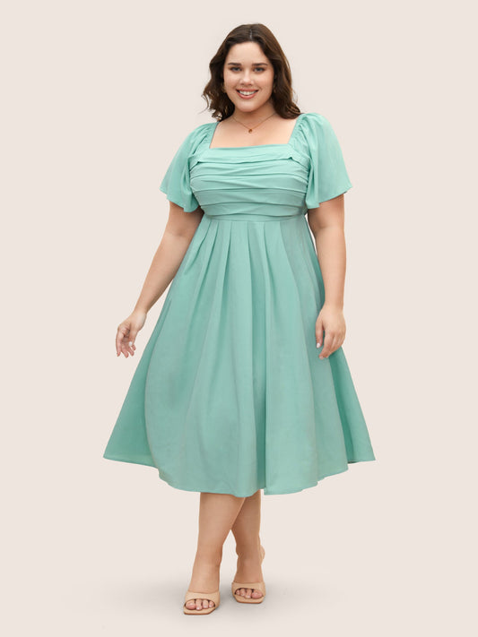 Square Neck Solid Pleated Ruffle Sleeve Dress