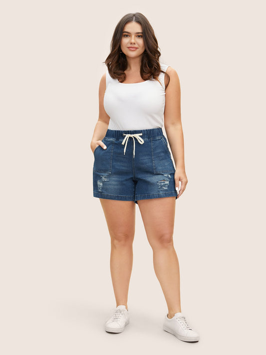 Dark Wash Drawstring Distressed Patch Pocket Denim Shorts