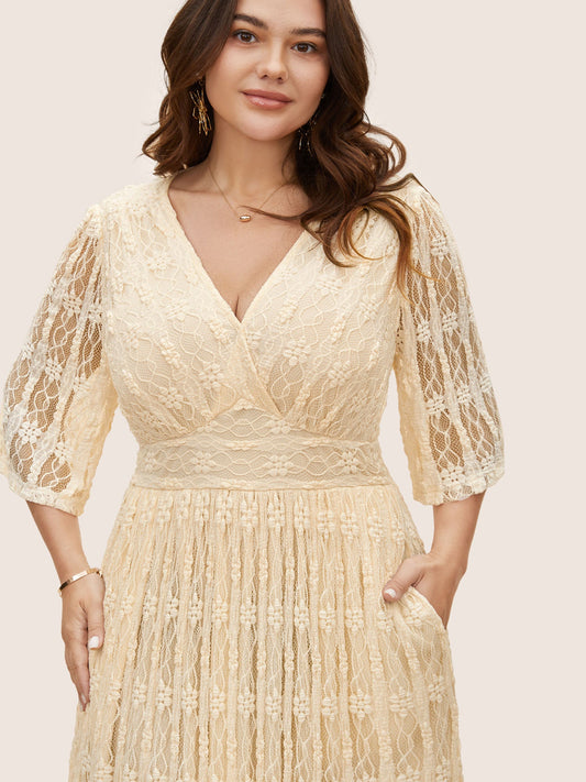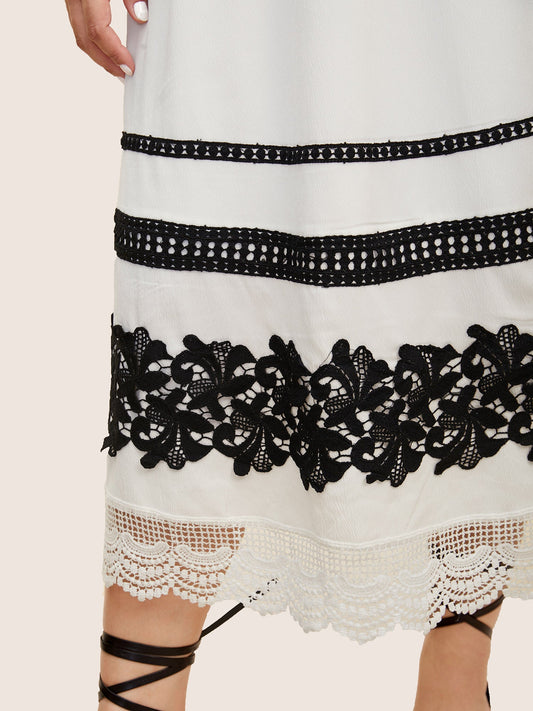 V Neck Contrast Lace Trim Ruffles Shirred Dress