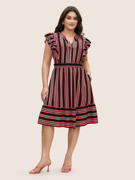 Polka Dot Button Detail Ruffle Sleeve Pleated Dress