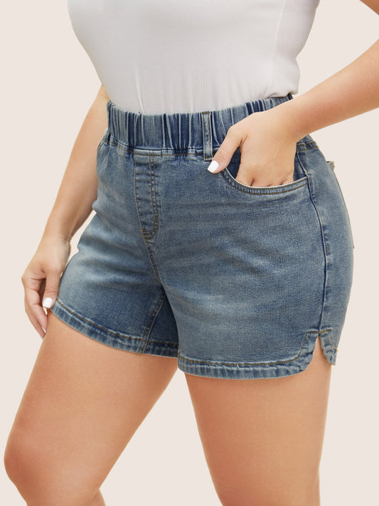 Light Wash Slit Hem Elastic Waist Denim Shorts