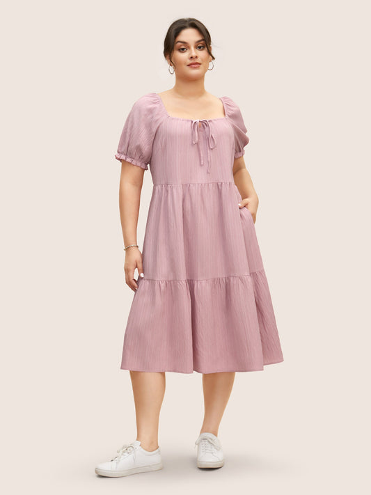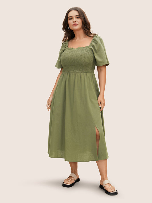 Cotton Square Neck Shirred Ruffle Sleeve Split Hem Dress