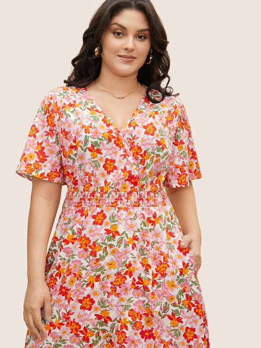 Floral Shirred Wrap Hem Ruffle Sleeve Midi Dress