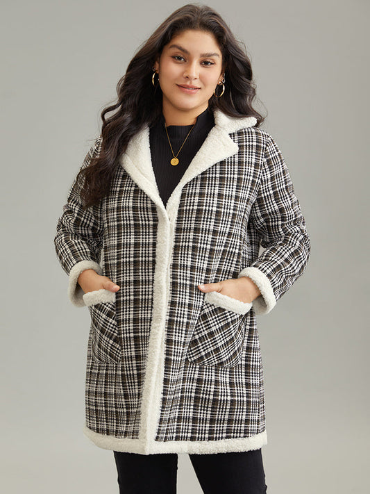 Plaid Fuzzy Trim Patchwork Lapel Collar Pocket Coat