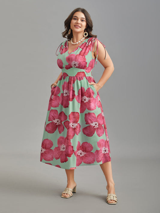 Multi-Color Floral V-Neck Pockets Midi Dress