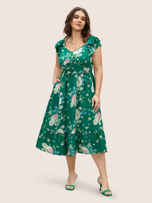 Floral Wrap Petal Sleeve Belted Dress
