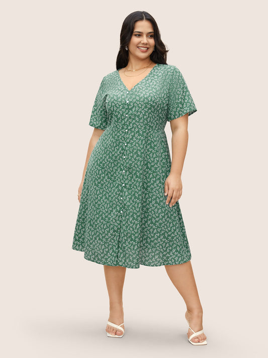 Ditsy Floral V Neck Button Detail Dress