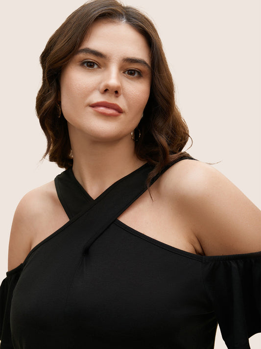 Solid Overlap Collar Ruffle Sleeve T-shirt
